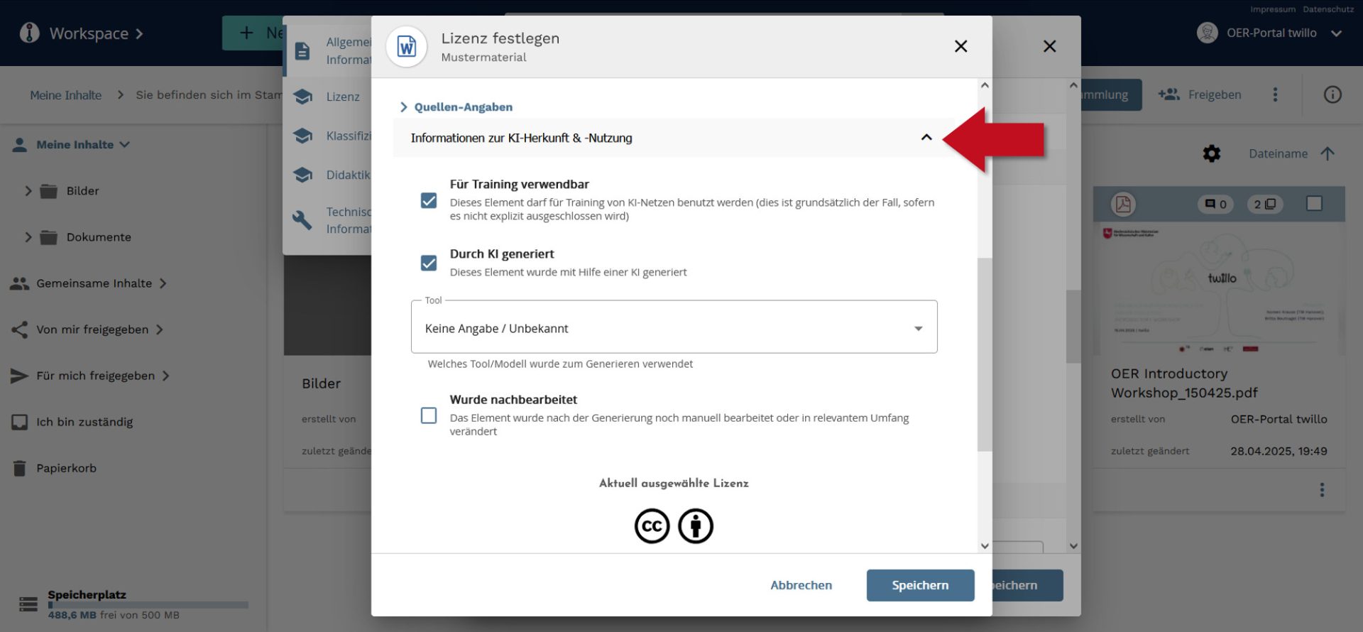 Sie können in den Metadaten Ihres Materials eine Information ergänzen, die darauf hinzuweist, dass ein Material KI generiert ist oder KI-generierte Anteile enthält.