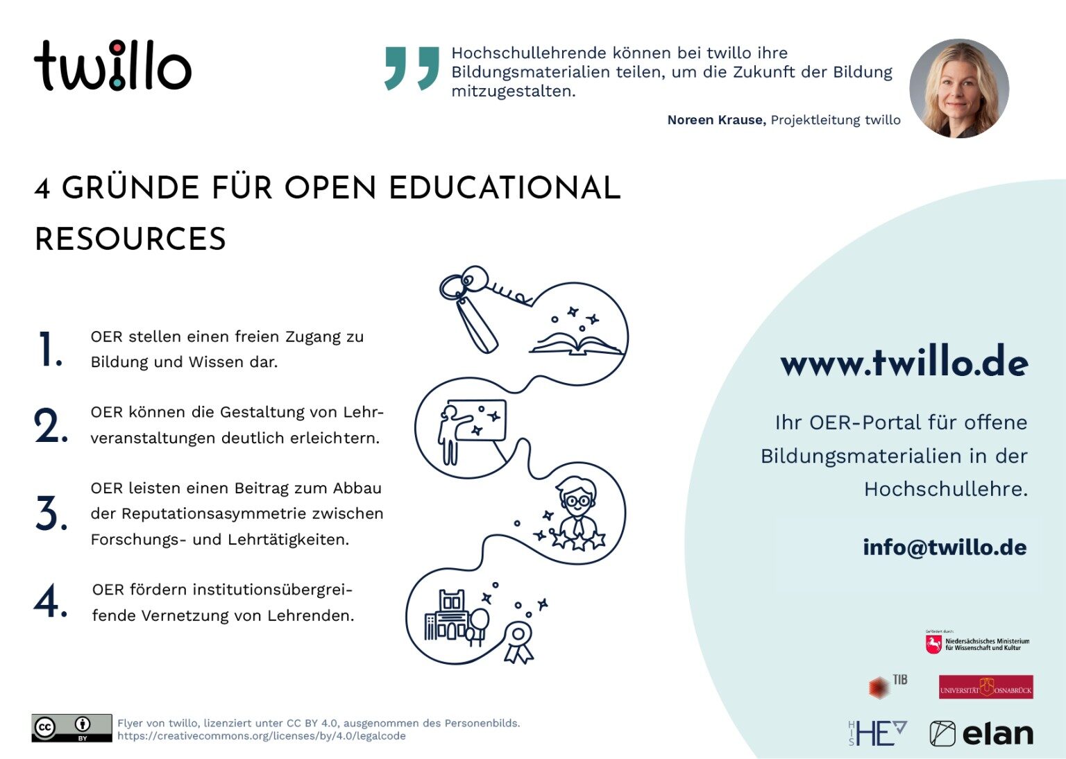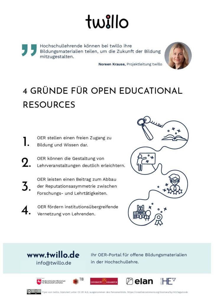 „Mit Open Educational Resources wird Bildung geöffnet“, erklärt Noreen Krause, Projektleiterin von twillo an der Technischen Informationsbibliothek (TIB). OER ermöglichen es, Lehrmaterialien flexibel an spezifische Lehr- und Lernkontexte anzupassen und erleichtern so die Gestaltung moderner Bildungsangebote. Neben dem Repositorium für OER bietet twillo umfassende Unterstützungsangebote – von Workshops über rechtliche Beratung bis hin zu spezifischen Services für Hochschulen.