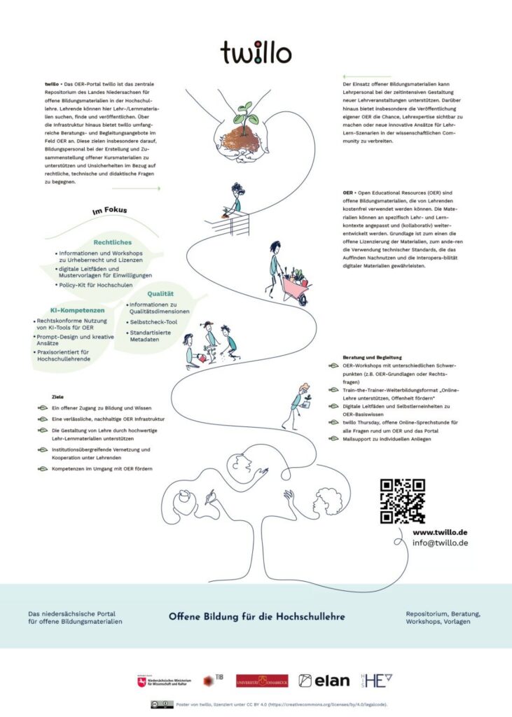 twillo.de ist das zentrale Portal für Open Educational Resources (OER) in Niedersachsen. Es bietet eine Plattform für kostenfreie und offen lizenzierte Bildungsmaterialien, die ausdrücklich zur Nachnutzung, Bearbeitung und Weitergabe zur Verfügung stehen.